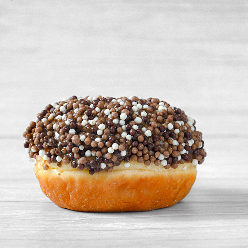 סופגניות שוקולד קרם לחנוכה, סופגניות טריות ורכות בציפוי קרם שוקולד עשיר, מעוטרות בכדורי שוקולד פריכים שמוסיפים מרקם מושלם בכל ביס. תוספת אלגנטית ומתפנקת לשולחן החג.